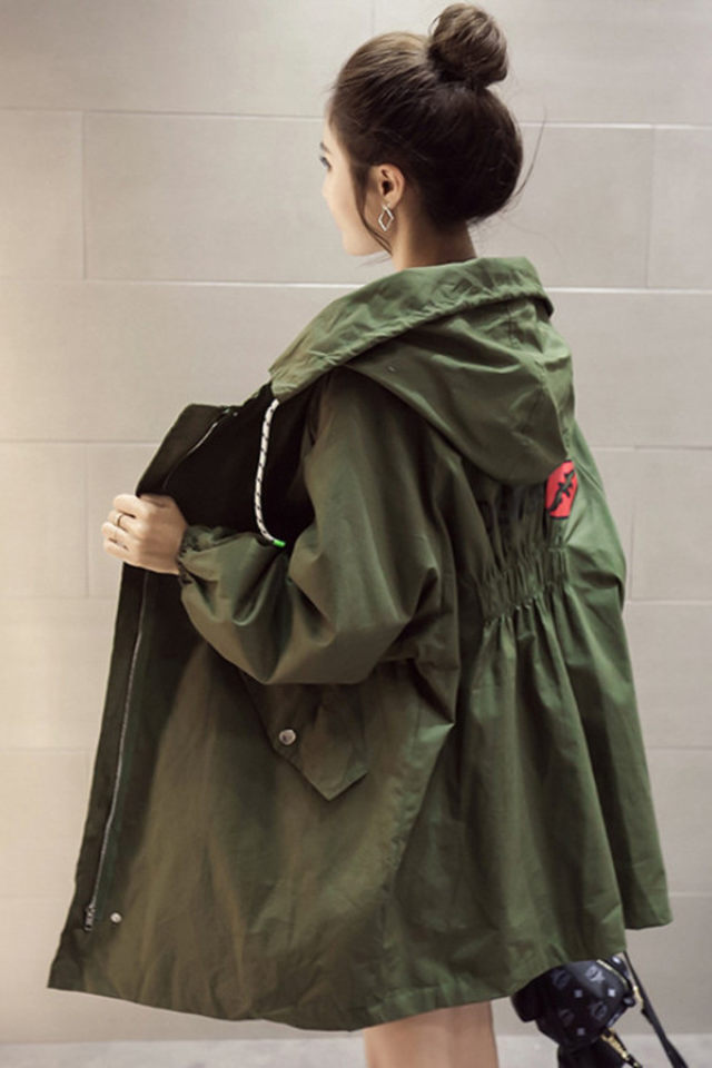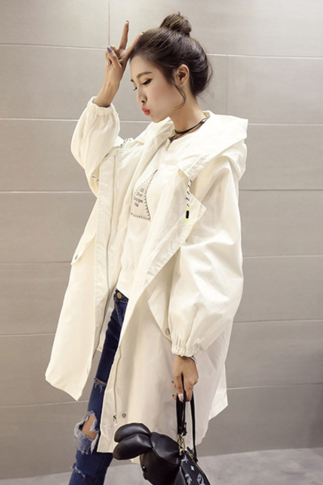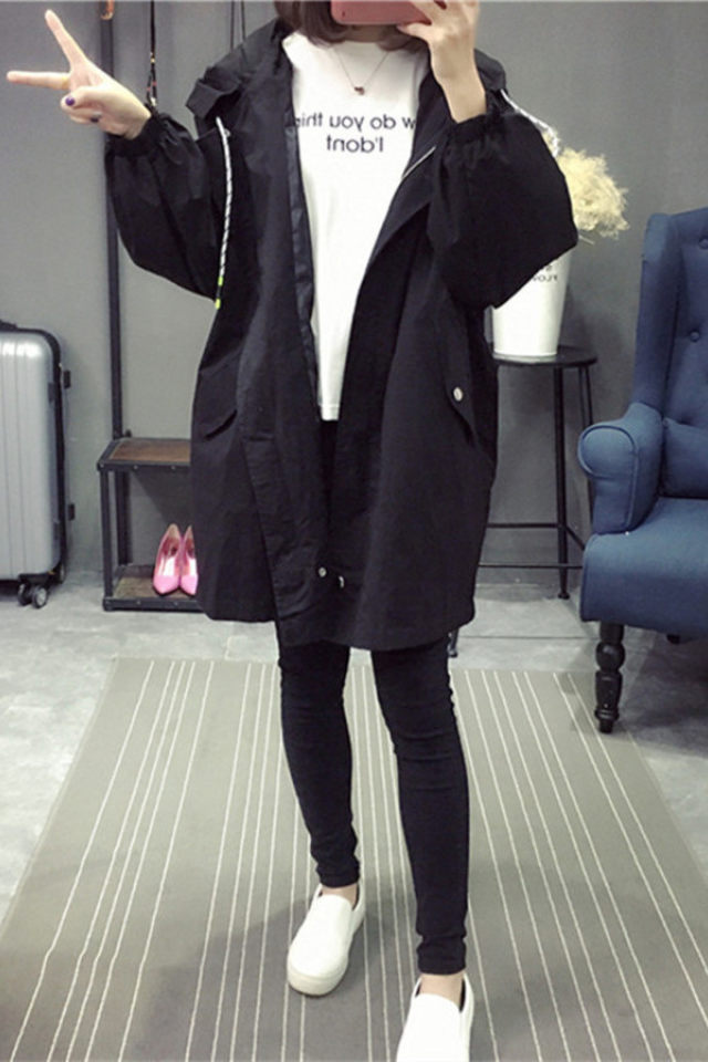 秋装新款韩版原宿风中长款宽松显瘦字母印花长袖连帽风衣女外套潮